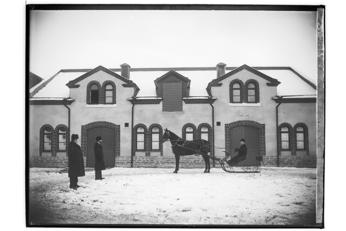 En och en halvvånings stallbyggnad.Tre personer och en häst med släde.