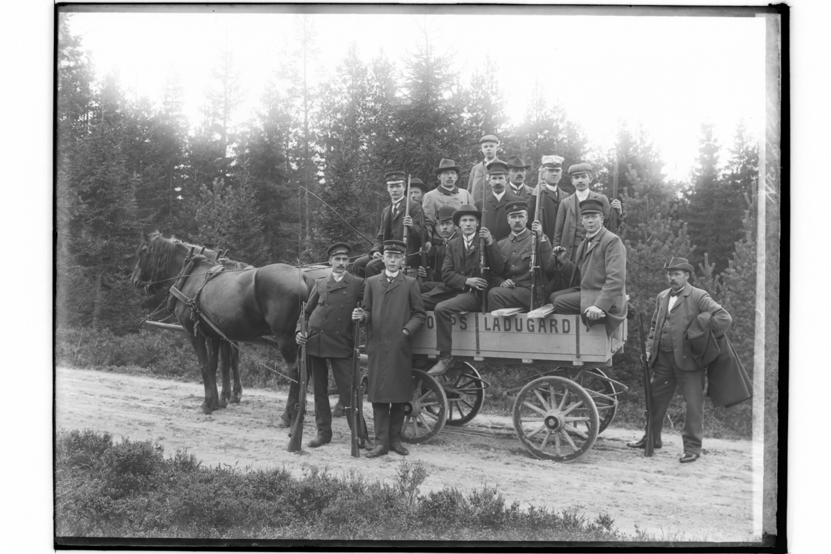 Latorps Skytteförening, 15 skyttar, 2 hästar spända för en flakvagn. Skjutstransport.