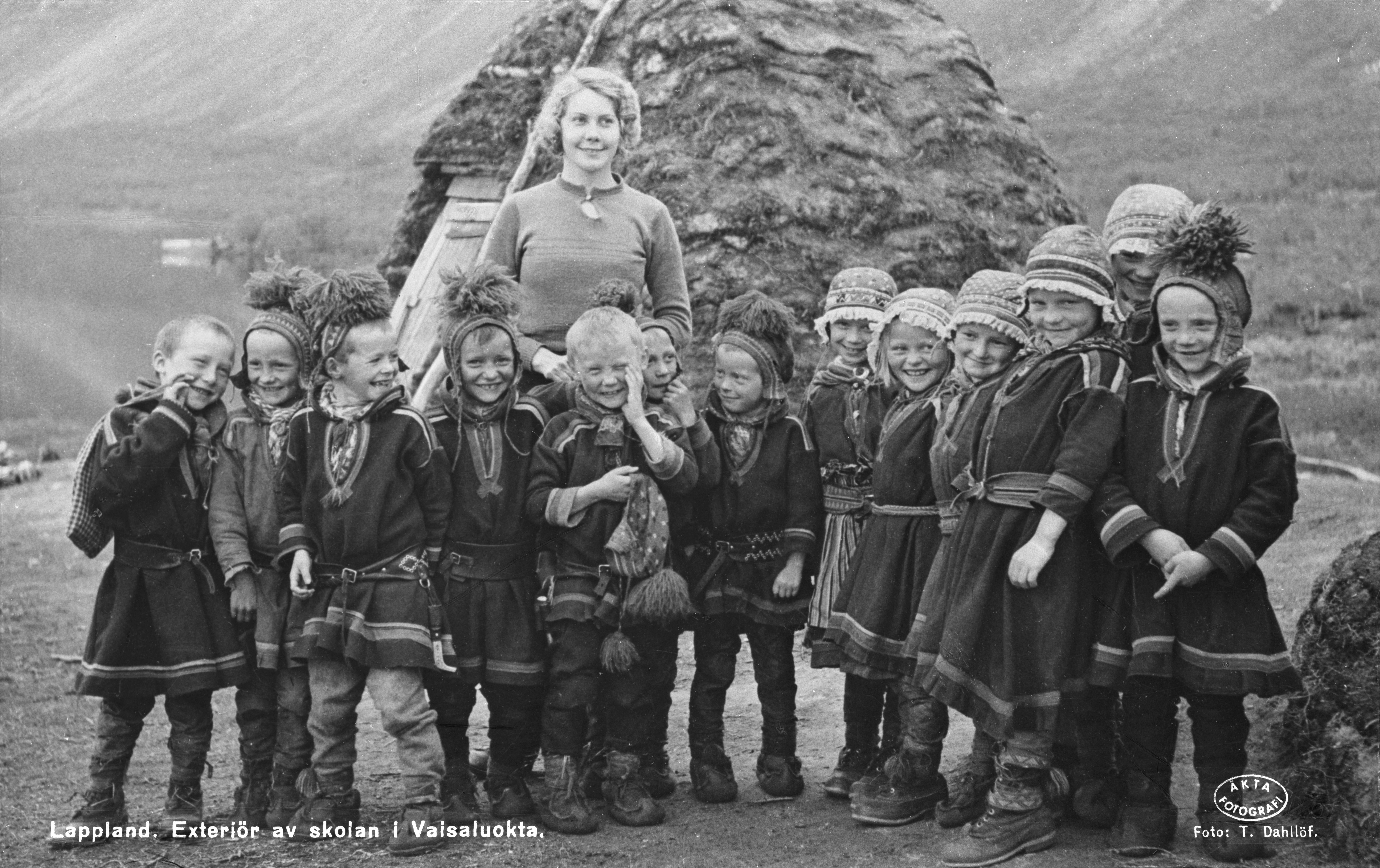 Exteriör av skolan i Vaisaluokta med lärare och elever framför.
