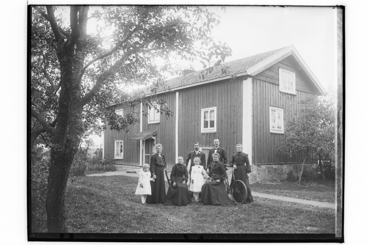 Tvåvånings bostadshus, 8 personer framför huset.