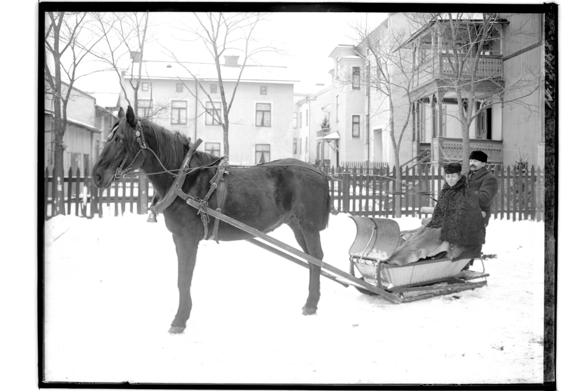 Häst och släde med 2 personer i, vid Engelbrektsgatan 52, Örebro.