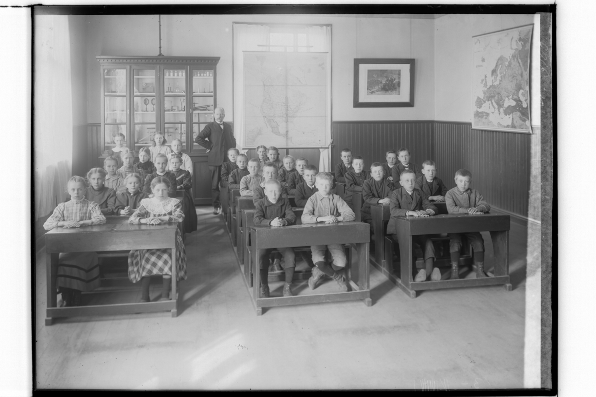 Sköllersta skola, klassrumsinteriör, 30 skolbarn sittande i skolbänkar och en lärare.