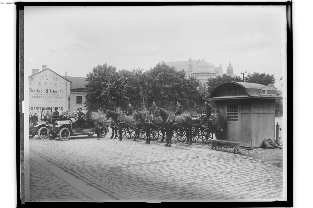 Till höger skymtar två av Örebros första taxibilar. Den vänstra bilen är en Scania som hade registreringsnummer T66. Den registrerades den 21:e december 1911 och ägdes av åkeriägare Axel Bergman. Den högra bilen är också en Scania, som hade registreringsnummer T63. Den registrerades den 10:e augusti 1911 och ägdes också av åkeriägare Axel Bergman.