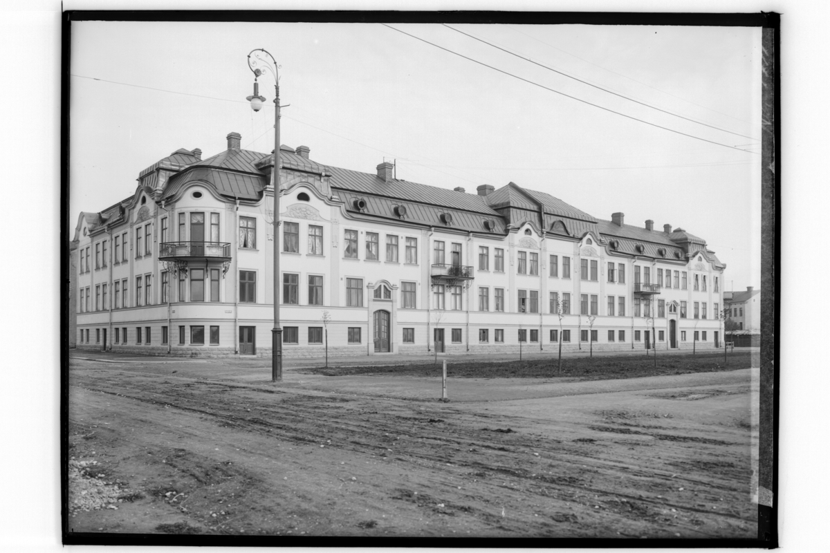 Trähus i två våningar med rik dekorerad jugendfasad i gul slätputs.