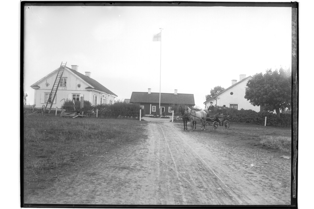 Lännäs Gästgivaregård, gästgivarebyggnad, tingshus och bostadshus. Ett par hästar framför vagn. En kusk och två passagerare. Tresidig gårdsbildning.