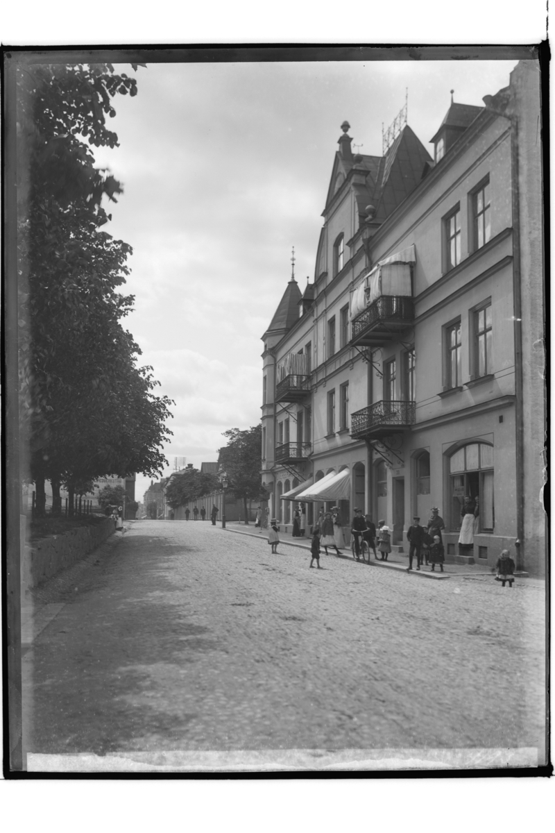 Trevånings bostadshus med frontespis och torn med affärslokaler i bottenvåningen.