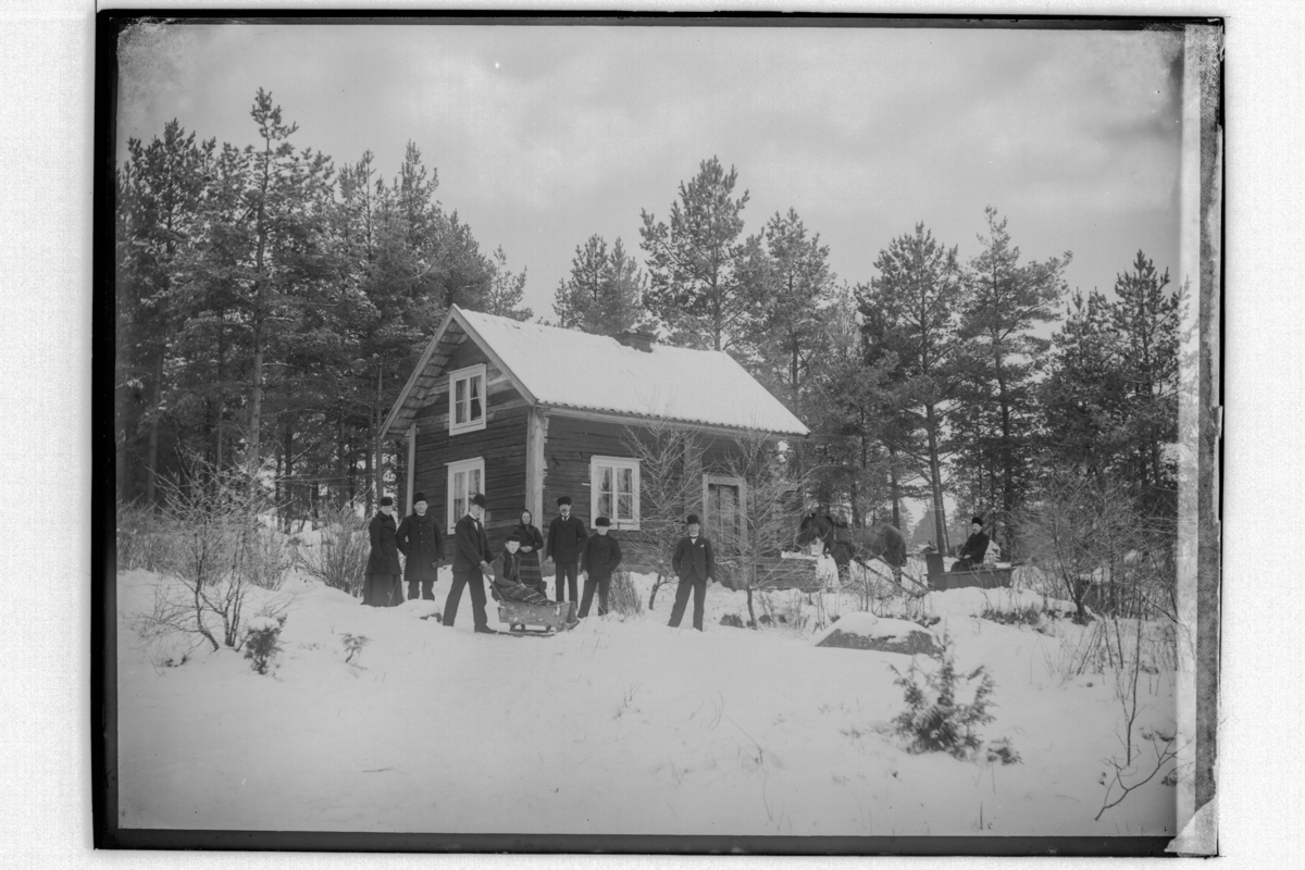 Byggnad, 9 personer. Enkelstuga, en och en halvplan. Hästskjuts.