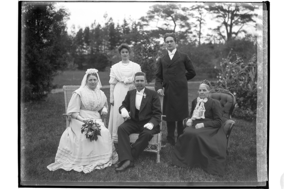 Bröllop. Bruden helt i vitt, brudgummen i frack.