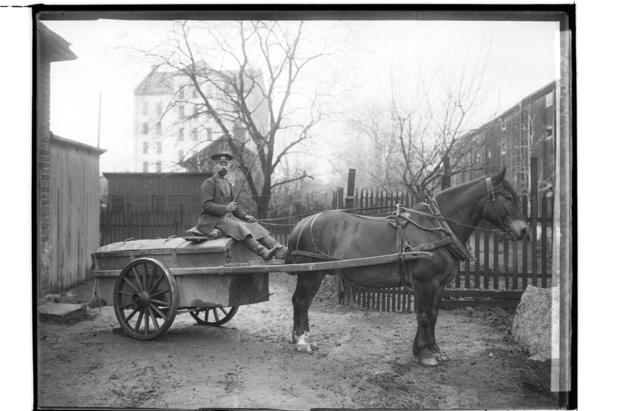 Örebro Renhållningsverk, häst spänd för tvåhjulig sopkärra.