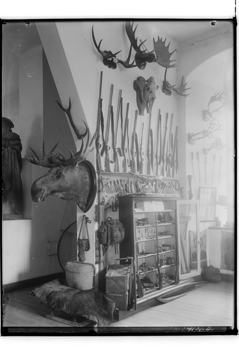 Jaktavdelningen, älghuvud, jaktgevär, ryggsäckar, m.m.