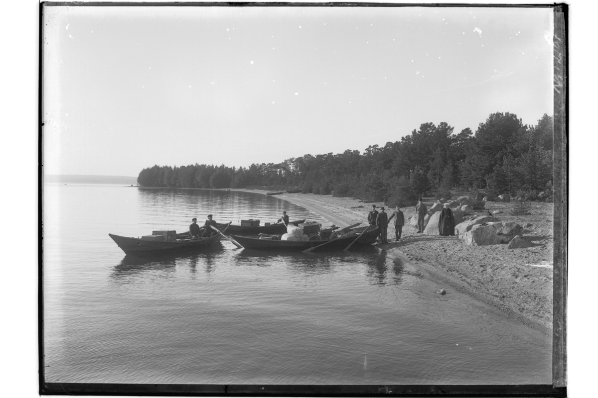 Tre hjälmarsnipor med last på stranden. Åtta personer.