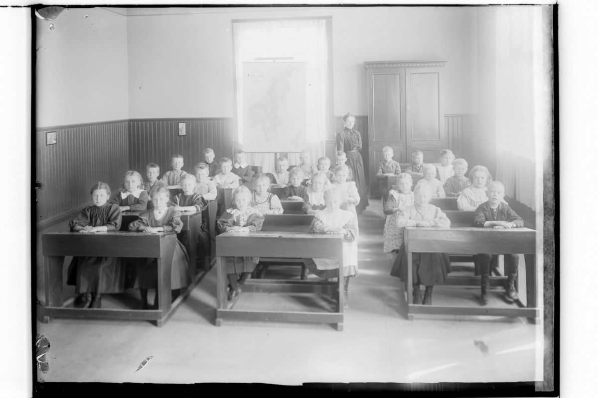Sköllersta skola, klassrumsinteriör, 29 skolbarn sittande i skolbänkar med lärare.