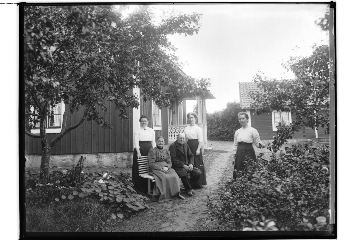 Parstuga med veranda, uthus, 5 personer i trädgården.