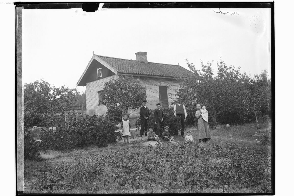 Ängstorp, envånings torpstuga, familj 9 personer framför huset.