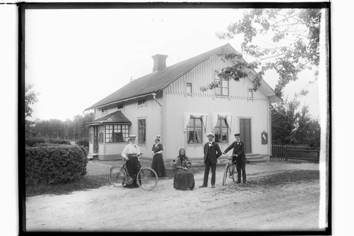 En och en halvplans bostadshus, 5 personer varav 2 med cykel.