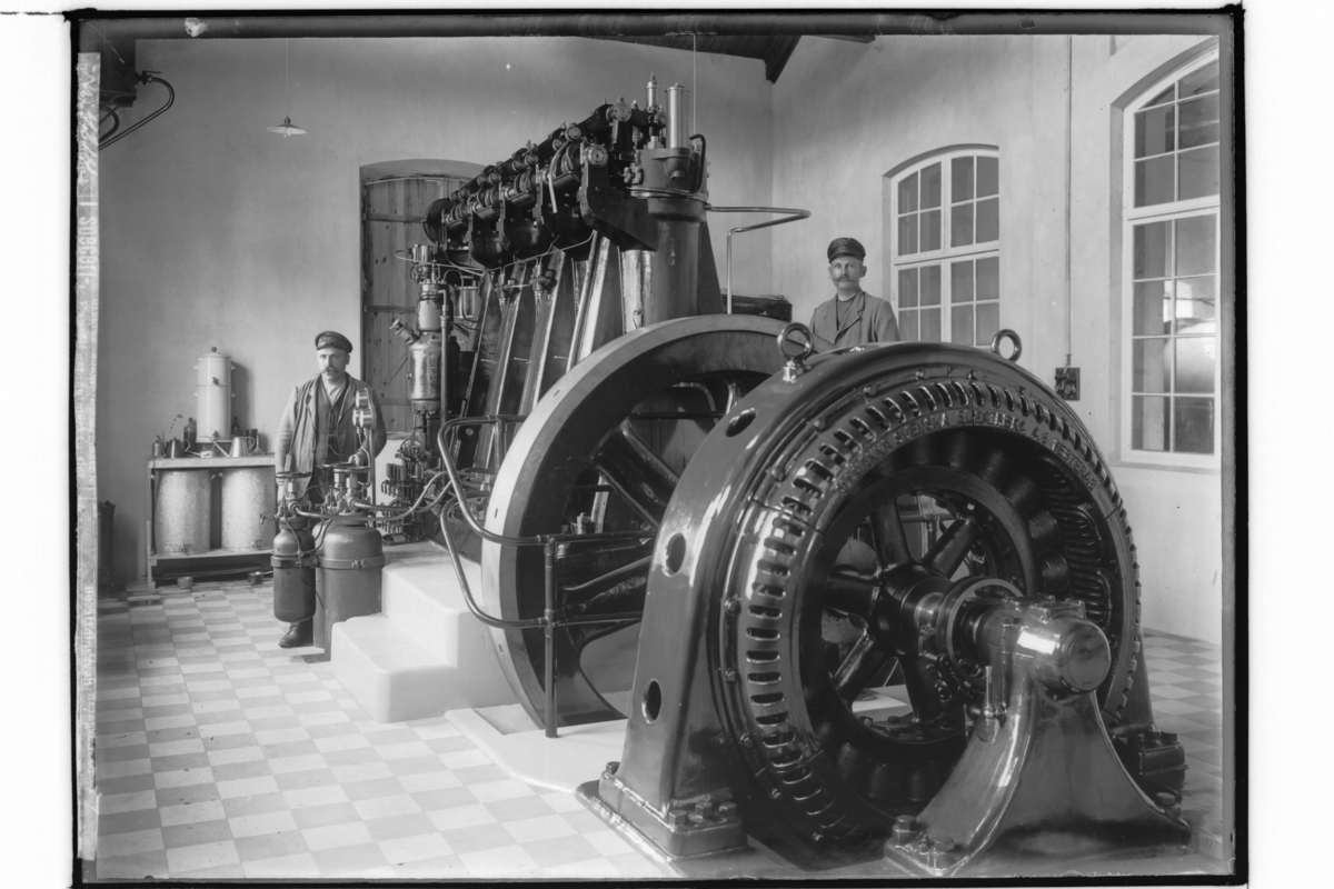 Karlslunds elverk, maskinhallsinteriör, elturbin och 2 maskinister.