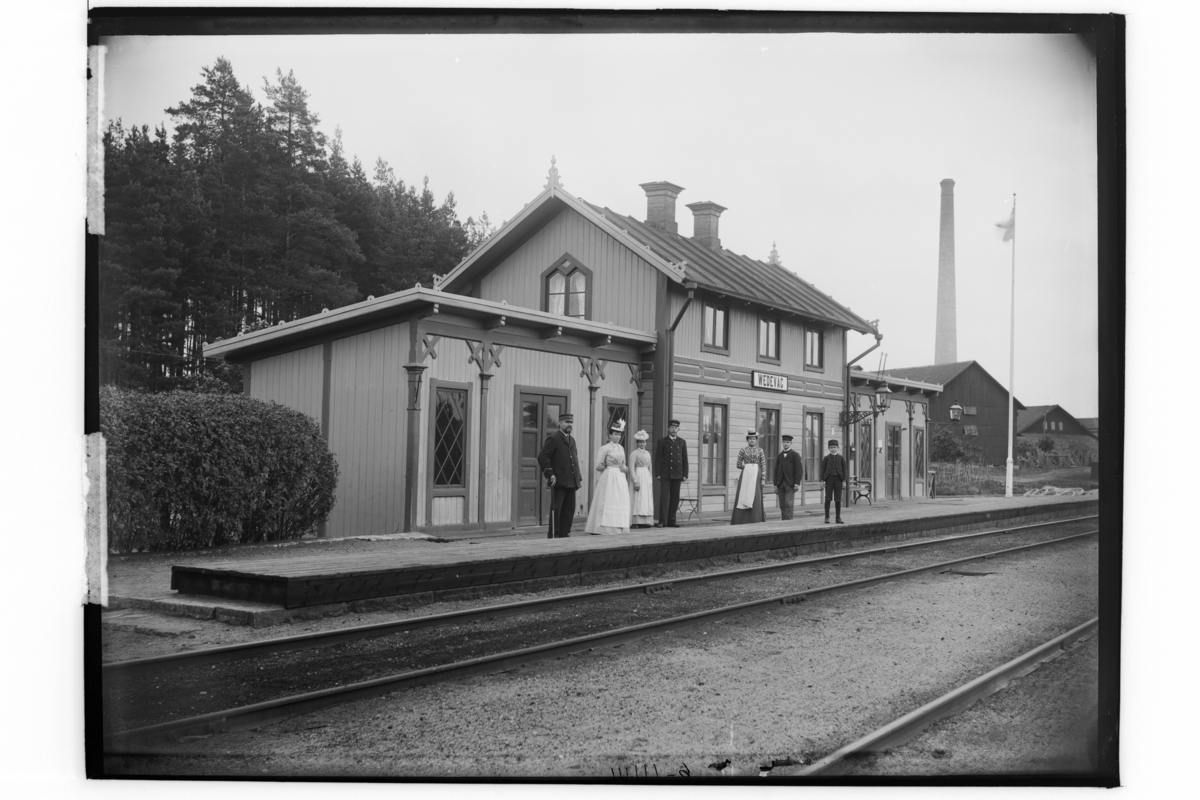 Tvåvånings stationsbyggnad med två flyglar. 7 personer på perongen. Framsidan.