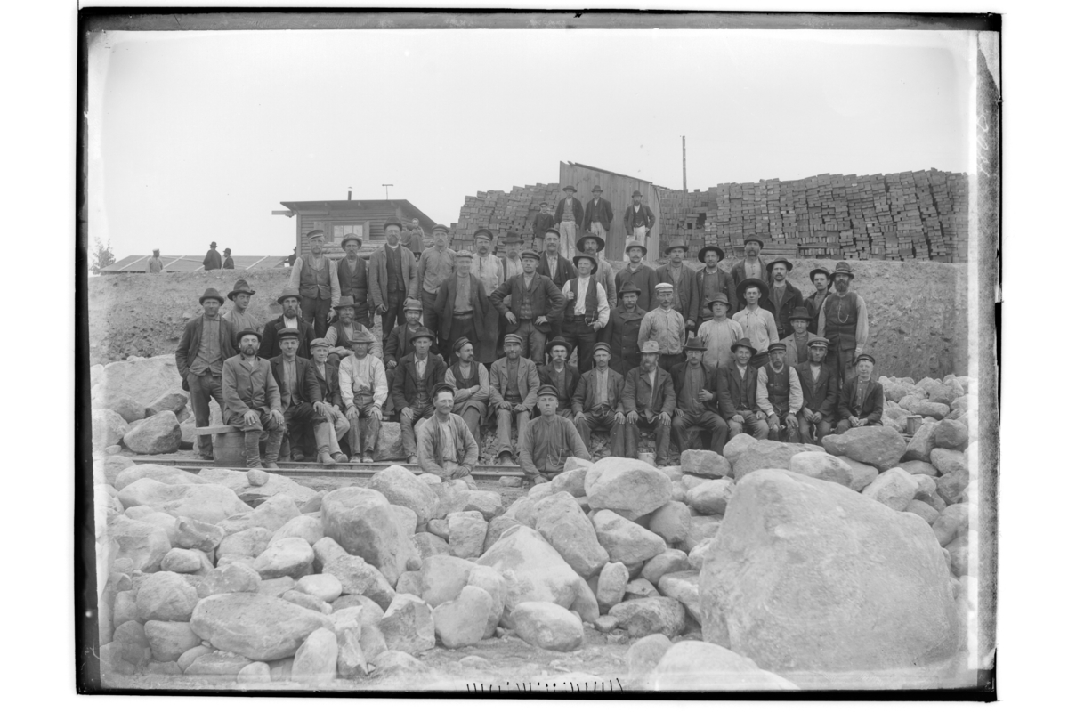 Fabriksbyggnad under byggnad och 49 byggnadsarbetare.