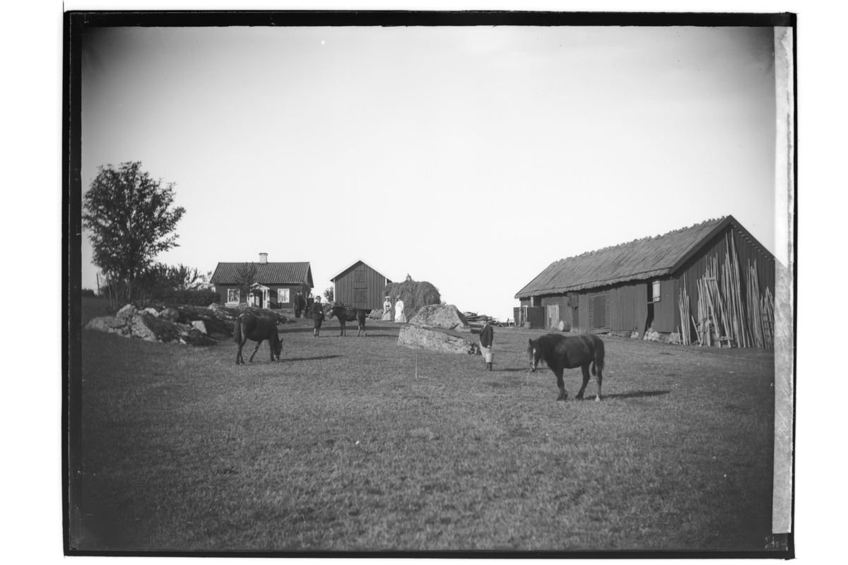Bondgård, bostadshus, två ekonomibyggnader, 5 personer och tre hästar.