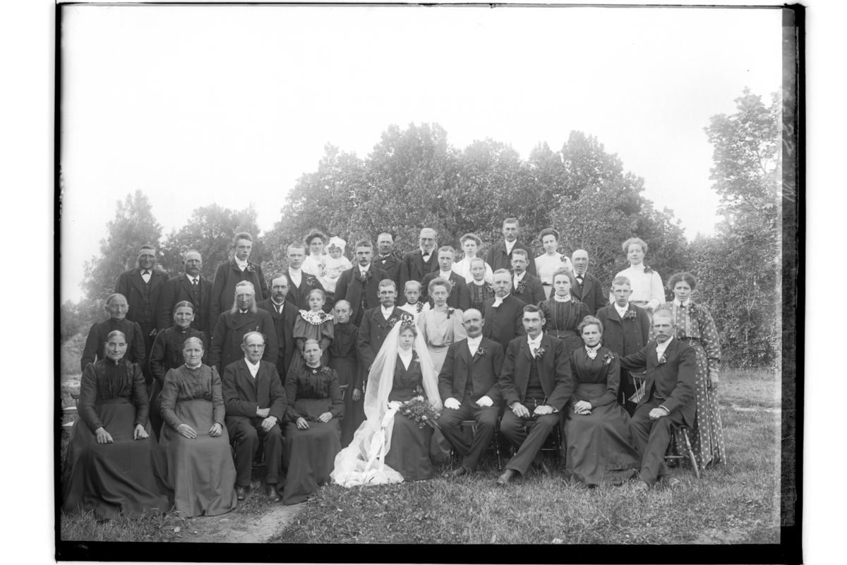 Brudpar och bröllopsgäster. Bruden i svart klänning, vit slöja, krona. Brudgummen i frack.