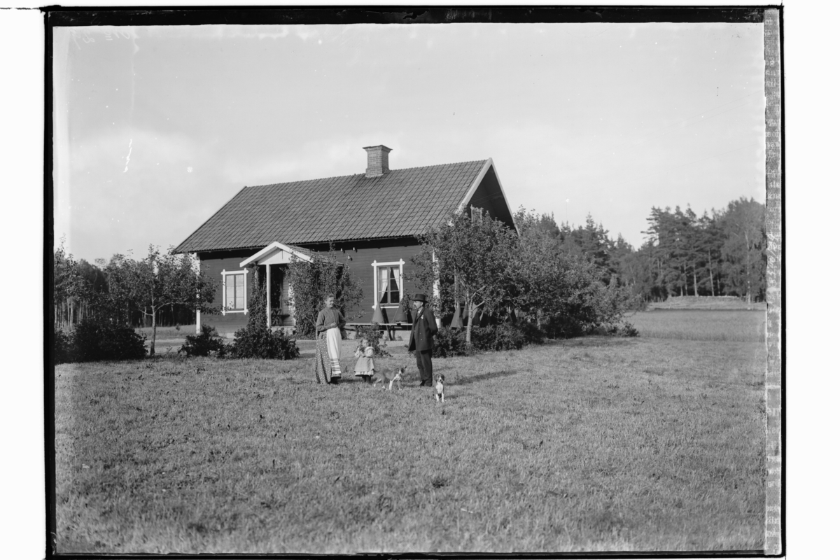 Familjegrupp tre personer och två hundvalpar framför huset. Skogvaktarbostaden.