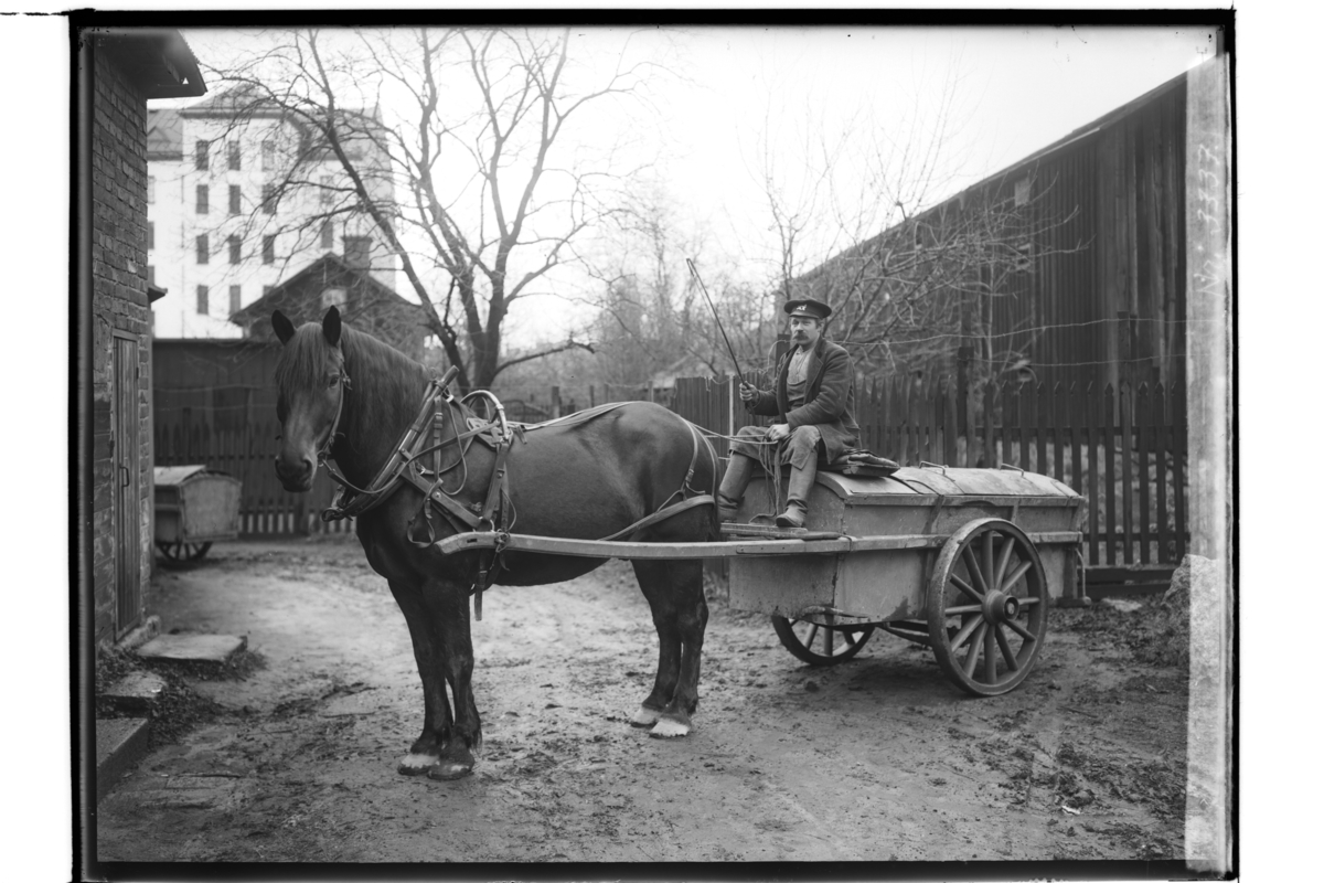 Örebro Renhållningsverk, häst spänd för tvåhjulig sopkärra.