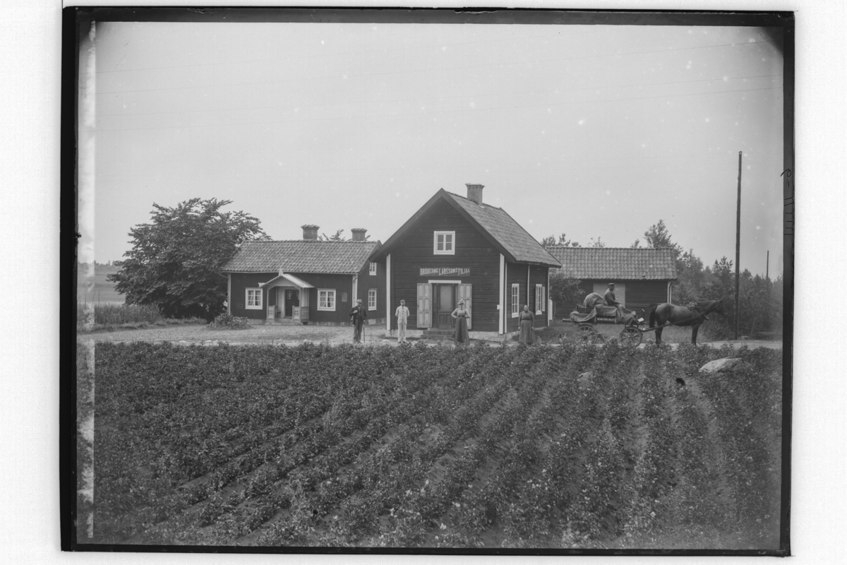 Byggnader, 5 personer. Handelsbod. Hästskjuts.