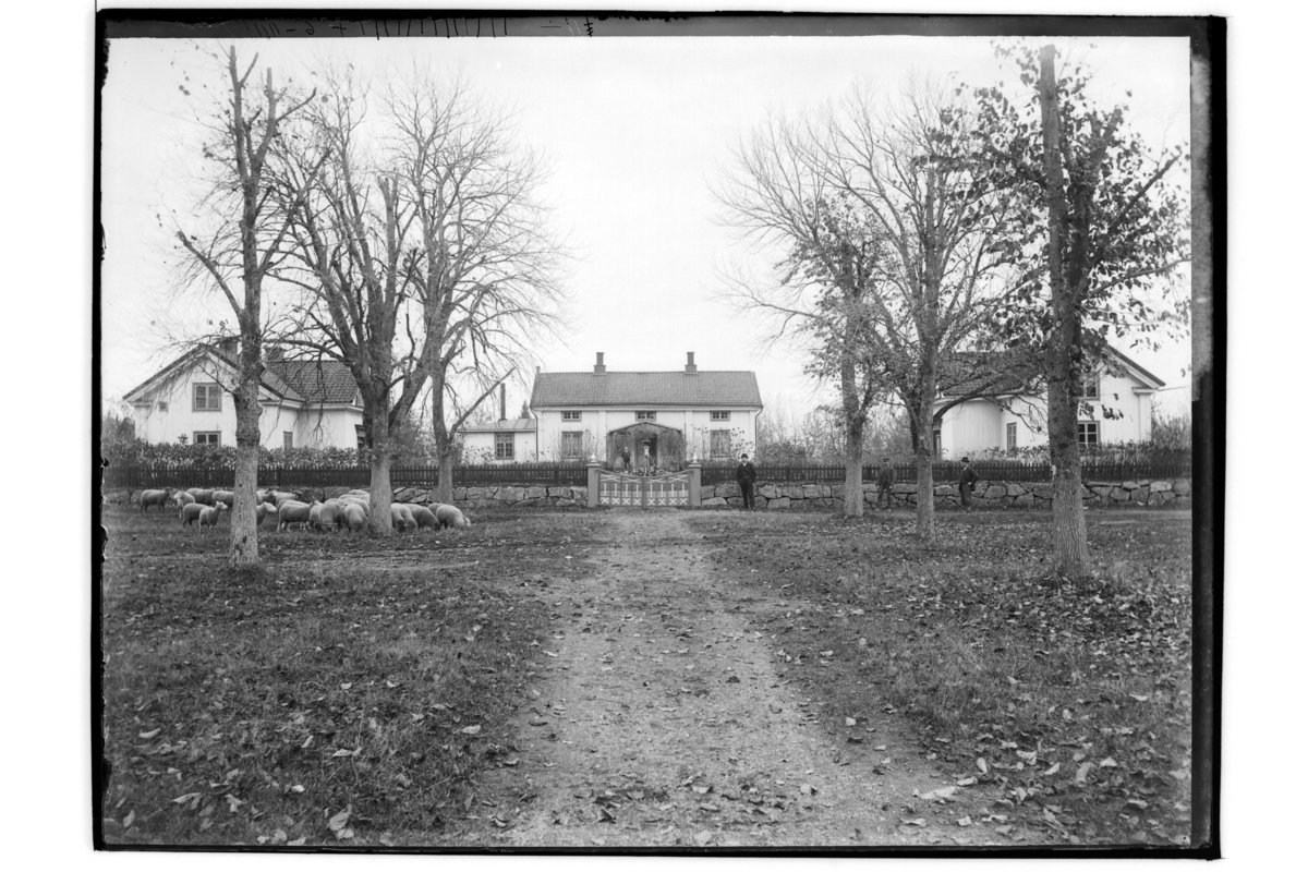 Byggnader, en och en halvvånings bostadshus, gård, två flygelbyggnader, 3 personer, får.