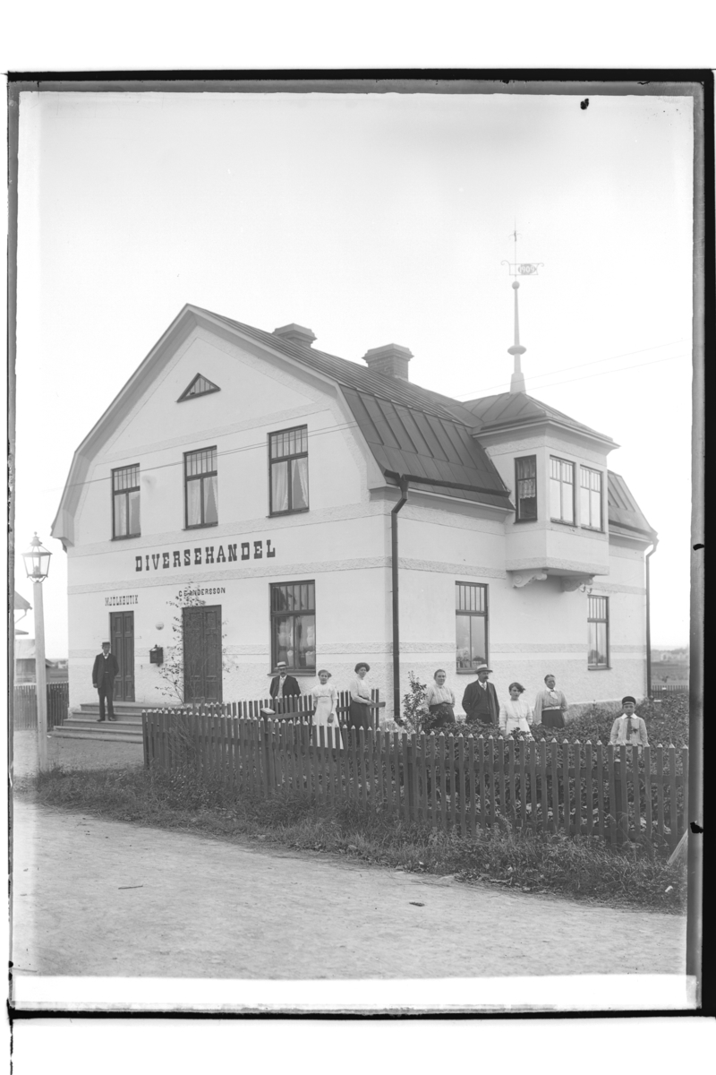 Diversehandel, en och en halvplans bostadshus, 9 personer.