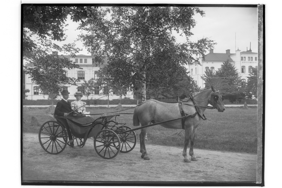 Häståkeri, häst förspänd till promenadvagn, 2 personer.