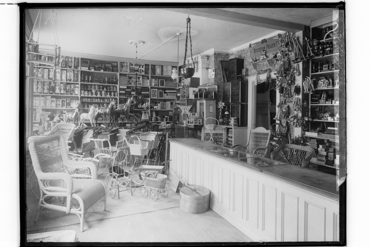 Nya Slöjdhandeln, affärsinteriör, leksaker och korgarbeten.