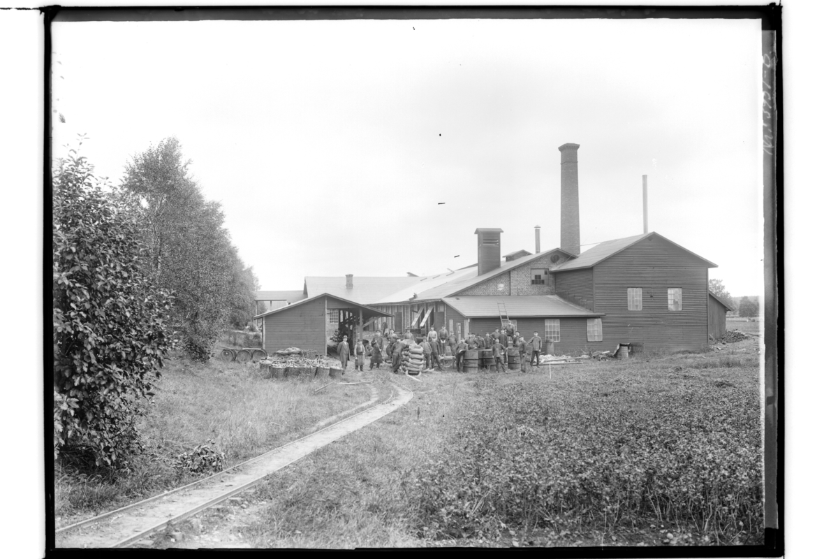 Fabriksbyggnader, 22 arbetare framför fabriken.