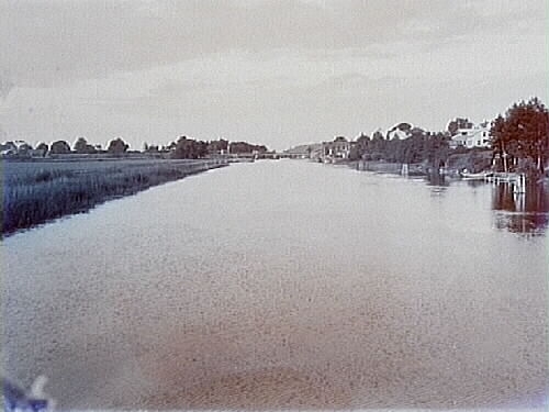 Kanalen. Byggnader vid stranden och järnvägsbron.