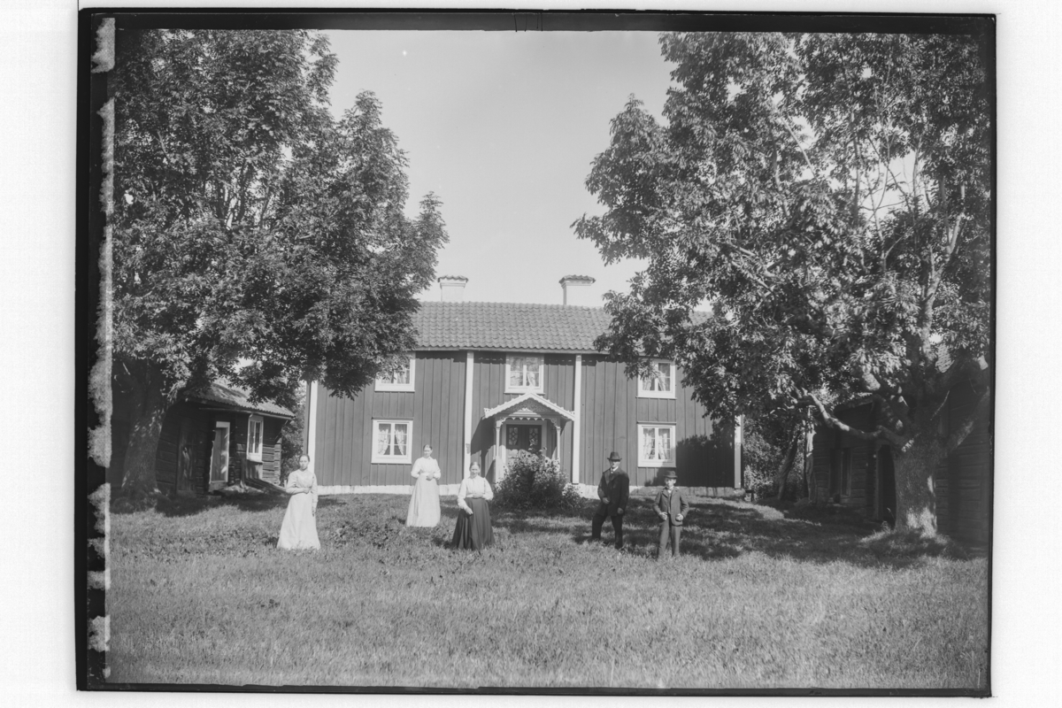 Byggnader, 5 personer, Tvåvånings parstuga och två uthus.