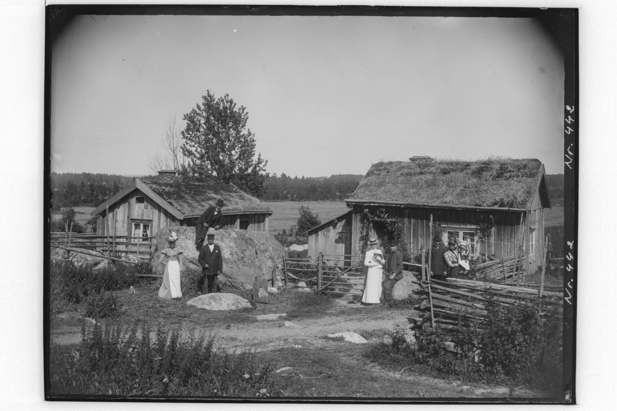 Ormesta, två stycken gamla backstugor med torvtak, trägärdesgårdar, 8 personer.