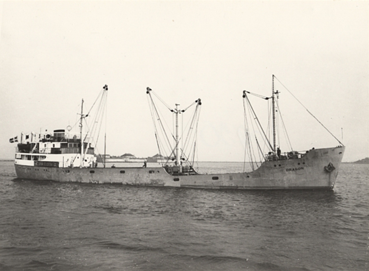 Foto i svartvitt visande lastmotorfartyget "DRAGON" i Köpenhamn under augusti månad 1953.