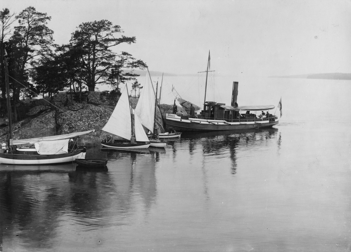 "Volontärseglingen Juli 1916" "Samling vid Granholmen" "Kostern till venster är Ing. Haglinds 'Bibit'"