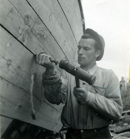 Motorgaleasen Ellen av Böda på slipen för reparation. Mannen på bilden är Peter Petersen.