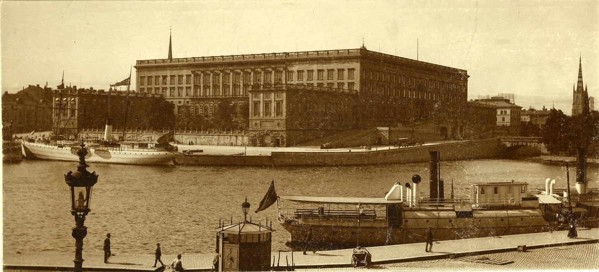 Del av Södra Blasieholmshamnen och i bakgrunden Skeppsbron samt Slottet. Ångaren vid Skeppsbron är Nordstjernan.
