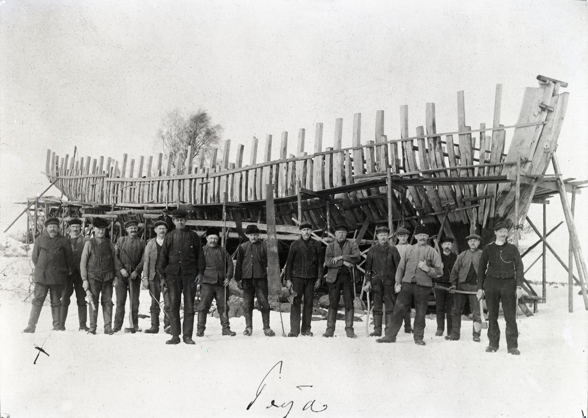 Fredriks Jonssons varv 1919. 3 msk Freja, 183 br.reg.t. under byggnad. I förgrunden varvspersonalen. Längst t.v. varvsägaren och byggmästaren Fredrik Jonsson.