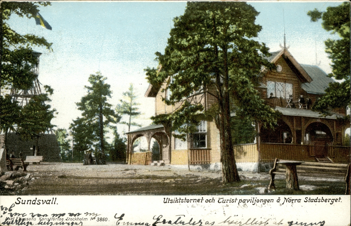 Vykort över utsiktstornet och turistpaviljongen på Norra stadsberget.