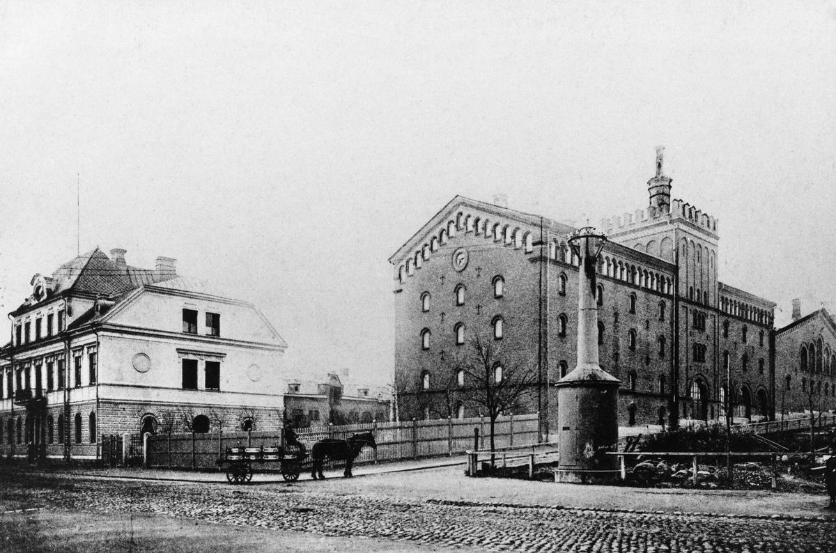 Nordstjernans bryggeri. Bildtext till vykortet "BRYGGERIET OCH KONTORSBYGGNAD". I förgrunden Storgatan och till höger Västra Allèn.