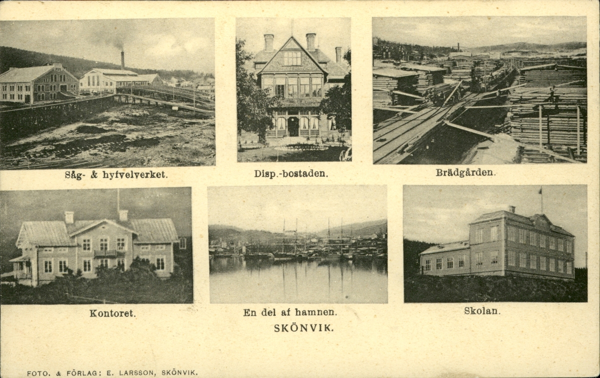 Vykort med motiv av infällda bilder över såg och hyvelverket, Disponentbostaden, Brädgården, kontoret, Hamnen och skolan vid Skönvik.