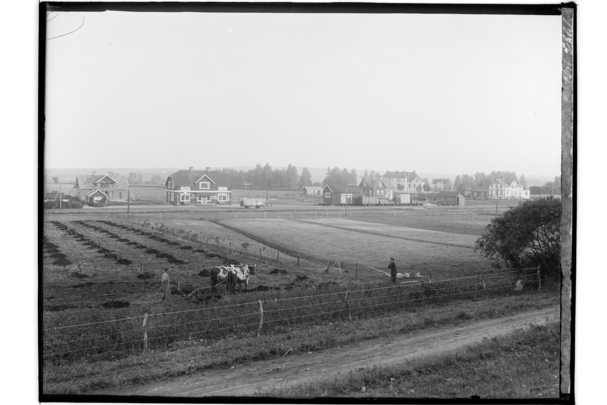 Vy över samhället. Inspektor Orre anlägger trädgård. En och en halvplans stationshus.