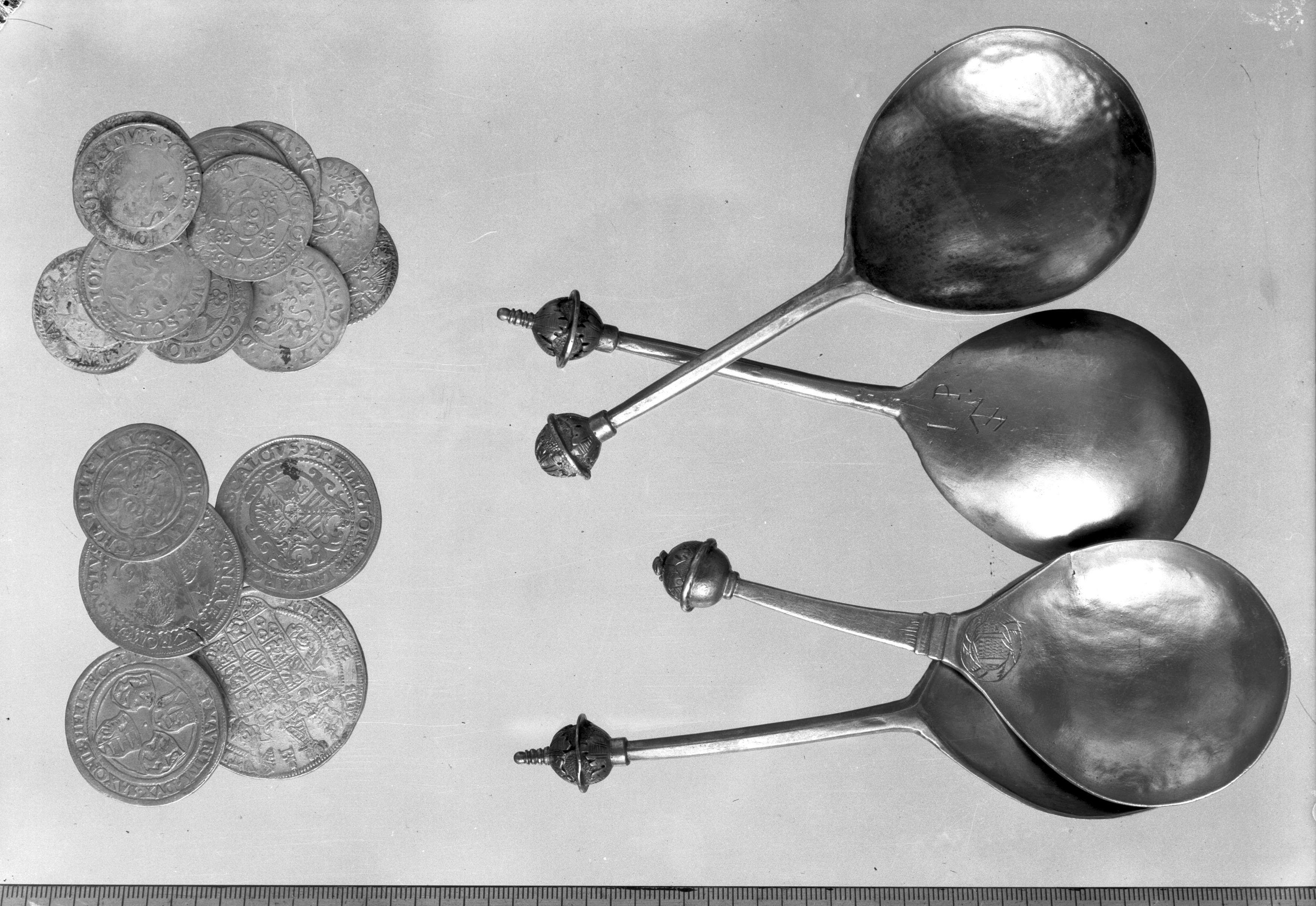 12 st.silvermynt och 4 st. silverskedar, funnet på kyrkogården. S.H.M.