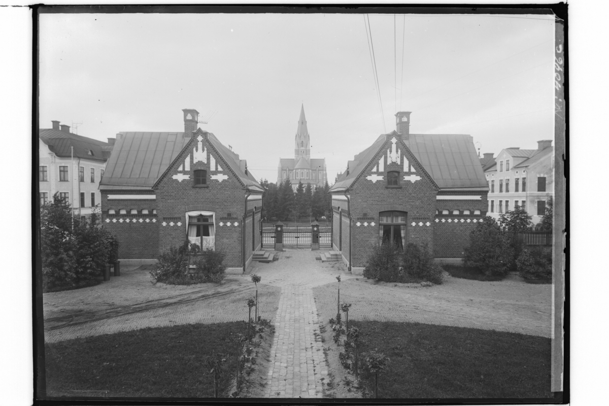 Epidemisjukhuset, entrén, två st envånings sjukhusbyggnader i tegel och järngrindar. Sofiaparken, i bakgrunden Olaus Petrikyrkan.
