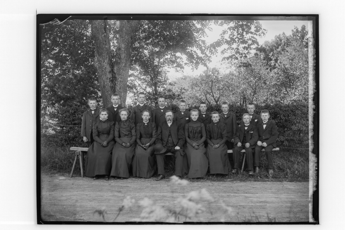 Rinkaby kyrka, konfirmander, 15 läsbarn och en präst.