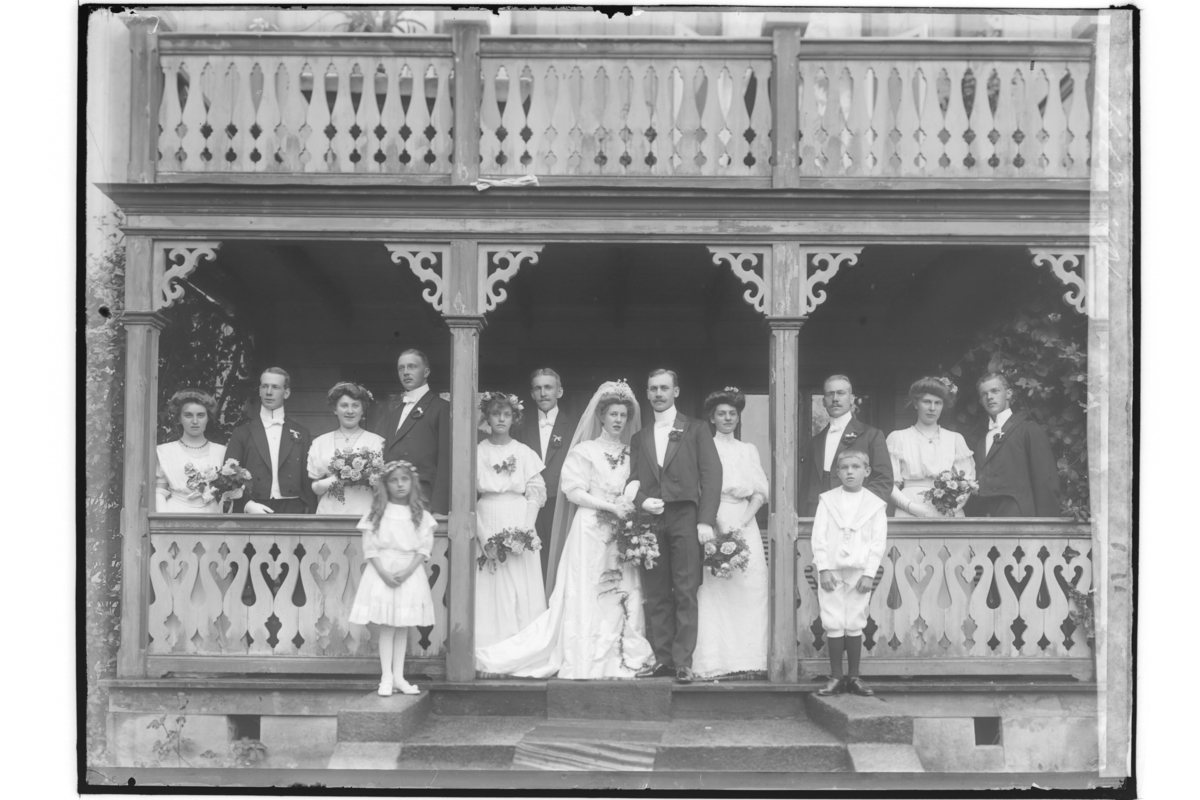 Bröllop. Brudpar och 12 gäster. Bruden helt i vitt med slöja. Brudgummen i frack.