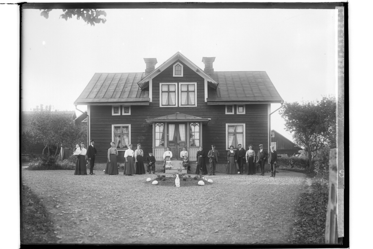 En och en halvplans bostadshus med frontespis och glasad veranda. Ekonomibyggnader.