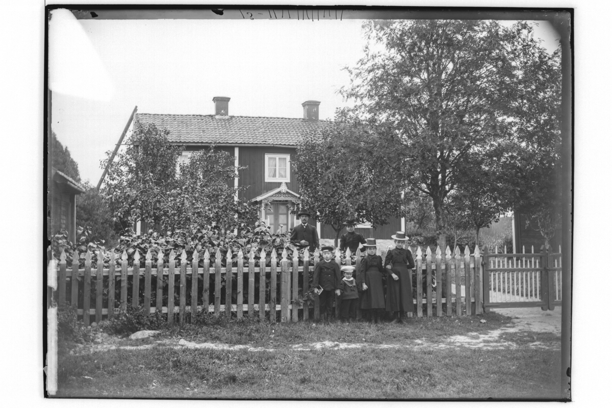 Byggnader, familj 6 personer. Parstuga i två våningar och två uthus.
